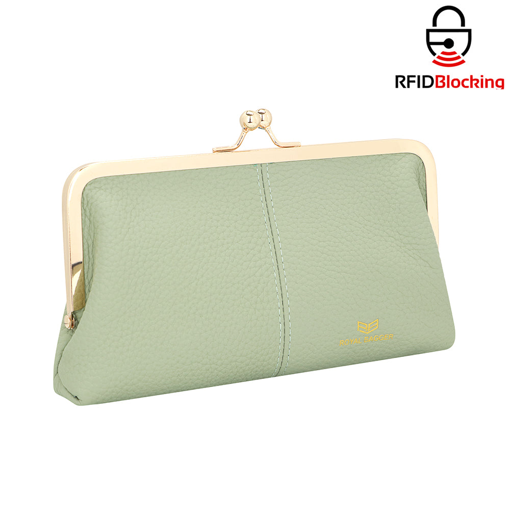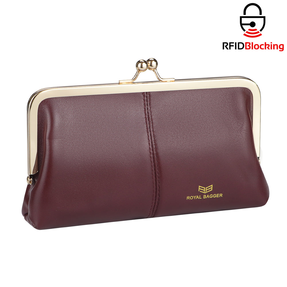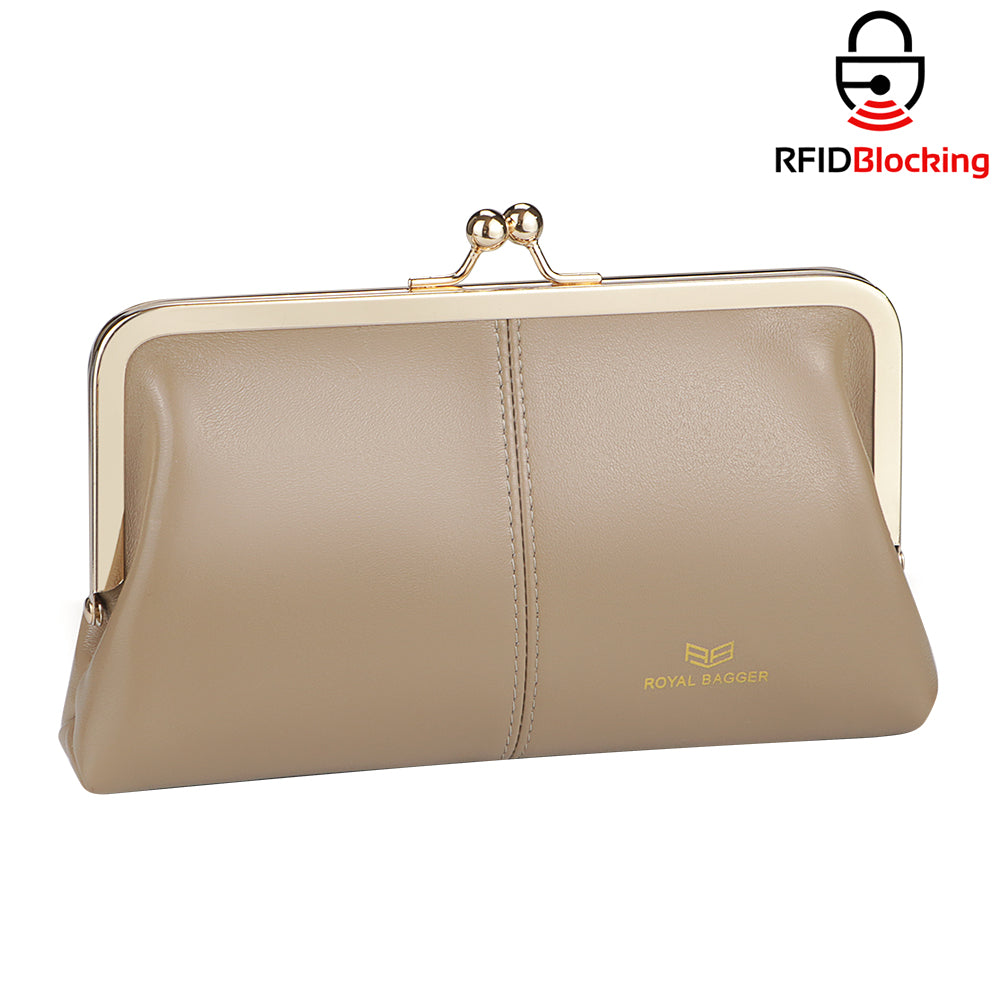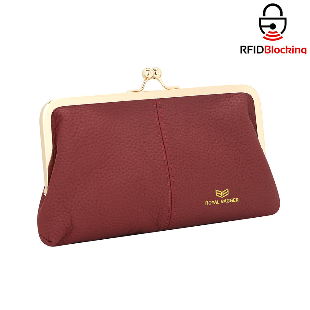 Royal Bagger RFID Kiss Lock Wallet, Solid Color Multi-card Slots Card Holder, Genuine Leather Clutch Purses for Women 1468