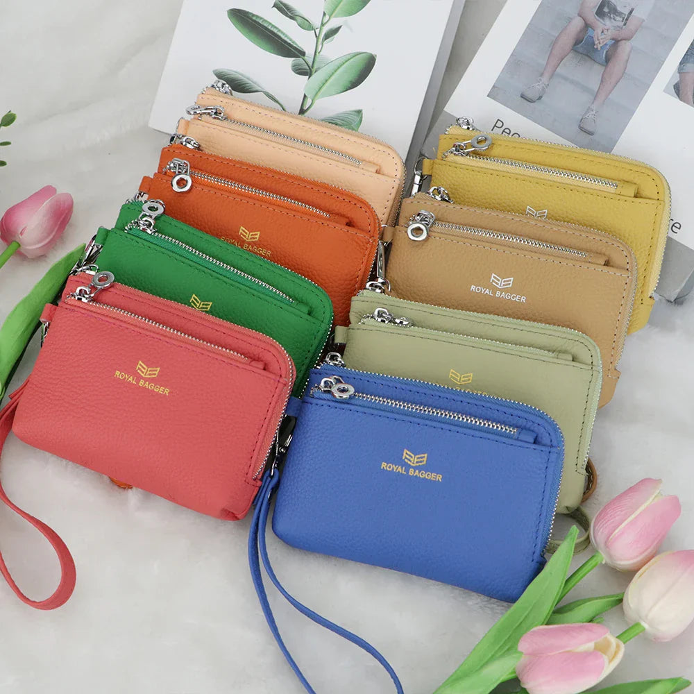 Royal Bagger RFID Coin Purse with Keychain, Genuine Leather Multi Zipper Clutch Wallet, Portable Wristlet Card Holder 1903-1