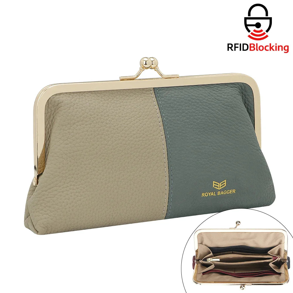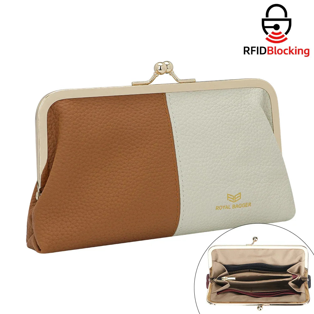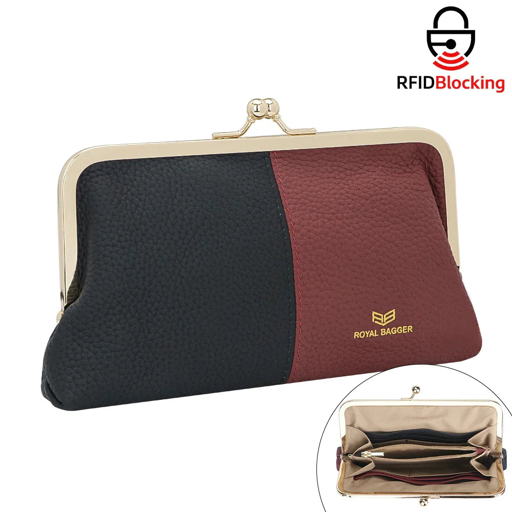 Royal Bagger RFID Blocking Genuine Leather Clutch Purse for Women, Elegant Evening Wallet with Kiss Lock, Phone Holder 2868