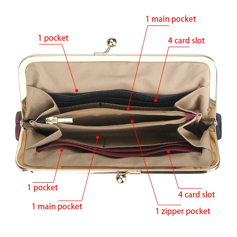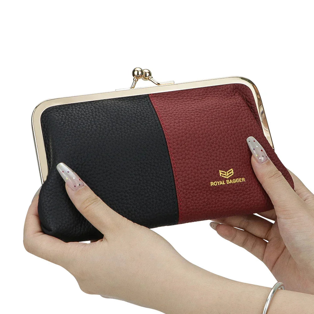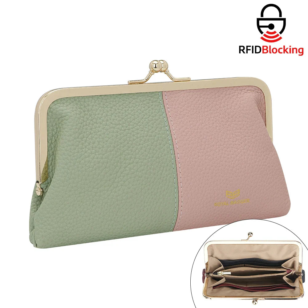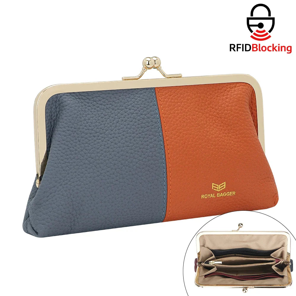 Royal Bagger RFID Blocking Genuine Leather Clutch Purse for Women, Elegant Evening Wallet with Kiss Lock, Phone Holder 2868