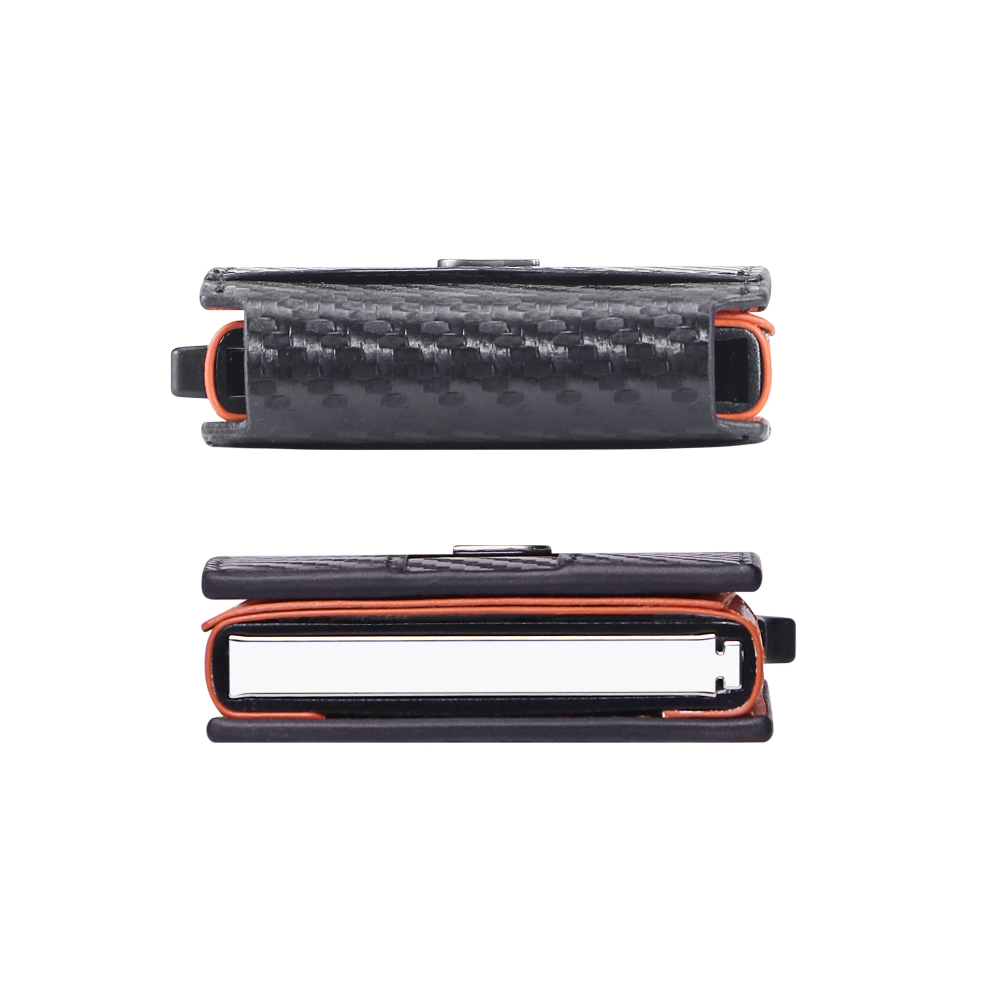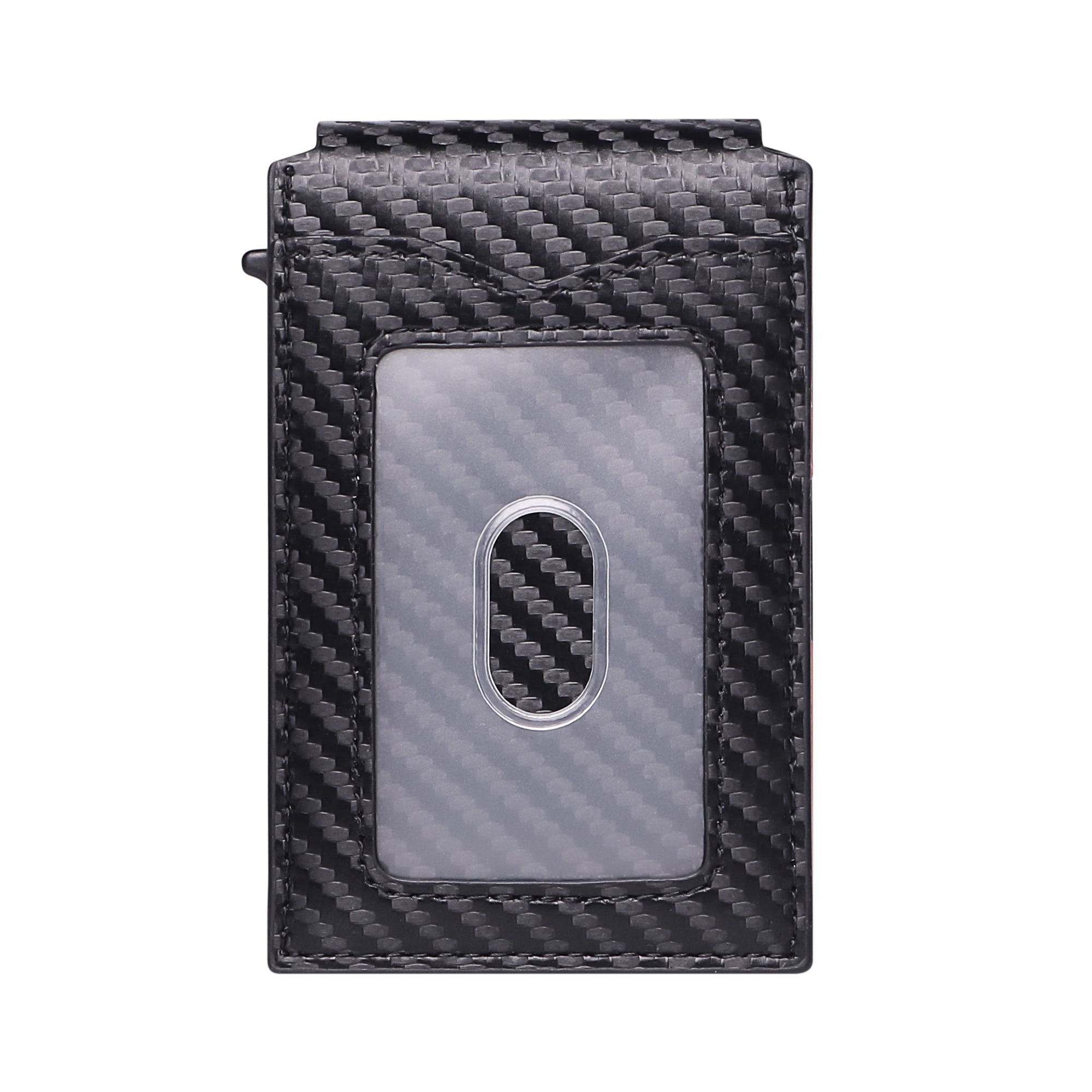 This men's travel wallet features a sleek, minimalist design crafted from durable carbon fiber and high-quality leather, offering both sophistication and strength. Equipped with RFID-blocking technology, it protects your personal information from unauthorized scans. Measuring just 2.55 x 0.78 x 3.93 inches, it’s compact and easy to carry, fitting seamlessly into pockets or bags.
